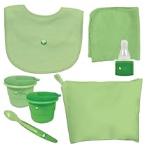 New. Set includes 2 snack cups, feeding spoon, water bottle cap adapter, waterproof absorbent bib, washcloth wipe, and Good to Go Pouch. Convenient for on the go.